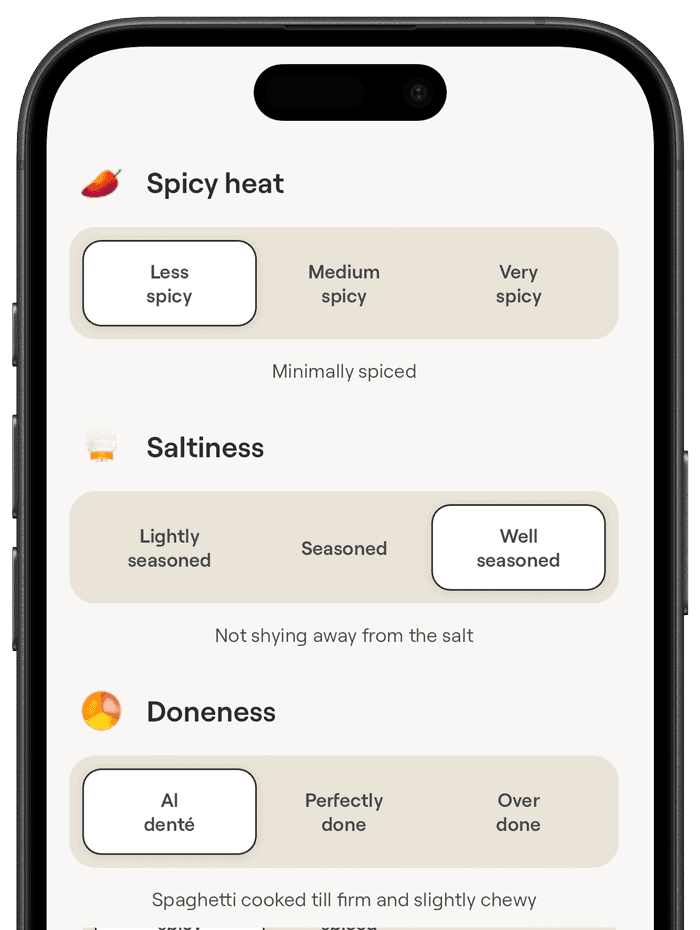 Whether it’s spice levels, diets, or allergens, adjust your meal to fit your preferences.
